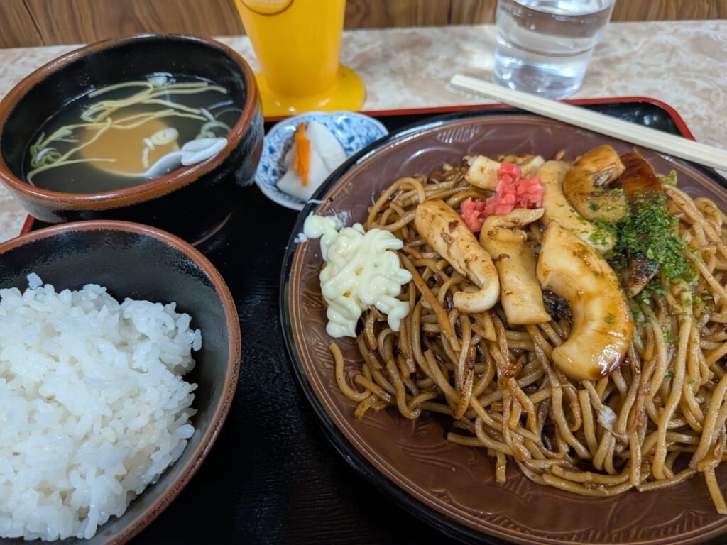 先日、味噌ラーメンにしたのでイカ焼きそば定食、890円にしました。行かれた方は分かると思いますが味が薄め(優しい味)です。また、テーブルには一切、調味料がありません。以前は給茶機の下にマヨネーズ置き場があったのですが、