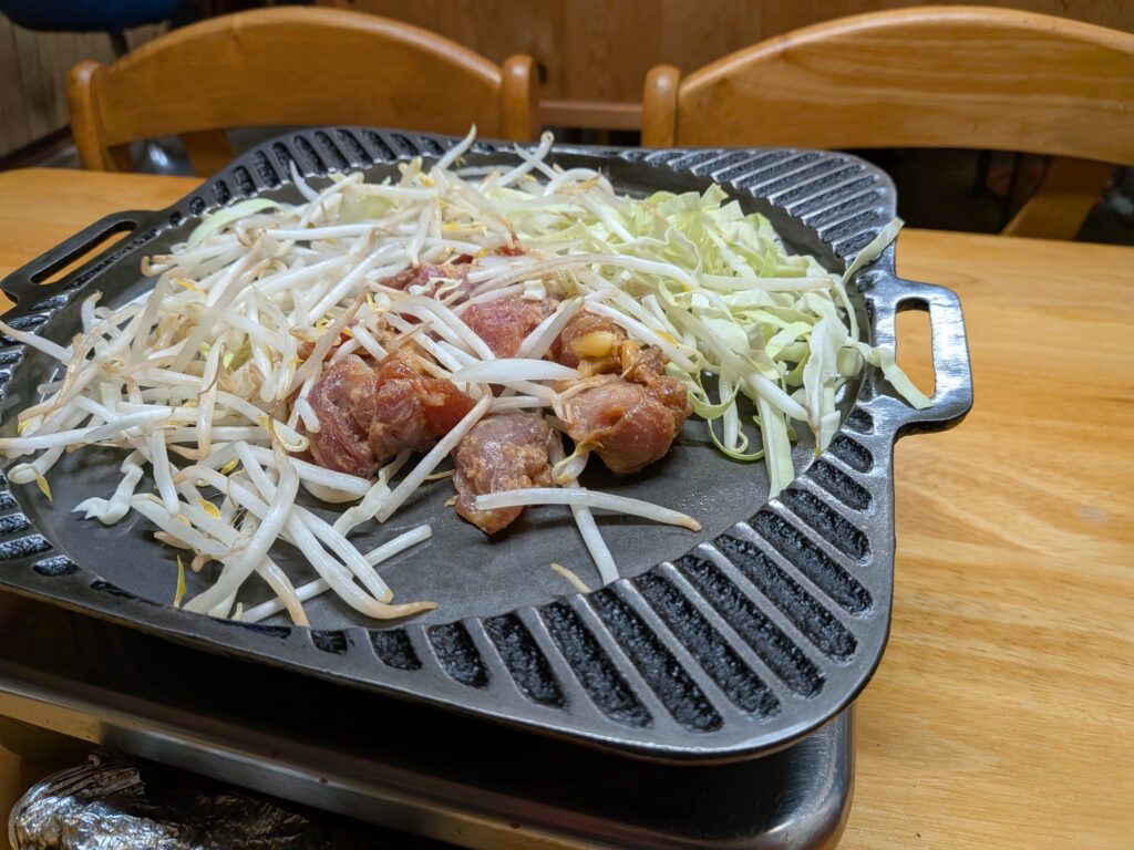 各テーブルにガス台が設置されていて注文するとこの鉄板がセットされ、その後鶏肉、モヤシ、キャベツが大きな皿に乗って運ばれてきます。自分で鉄板に乗せて焼いていきます。上の画像は乗せた直後です。