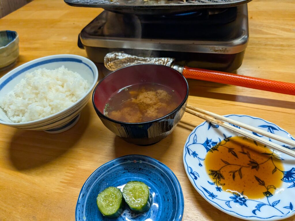 そろそろ焼きあがる、のタイミングでご飯セットが運ばれてきます。ご飯の量は大・中・小から選べます。中を選びましたがご飯を食べ終わっても鶏肉が余りましたので次回は大で注文するつもり。タレを付けて食べますがにんにく味とショウガ味を選べます。にんにく味を選びましたがにんにくを感じませんでした。
