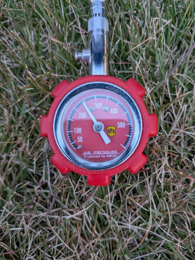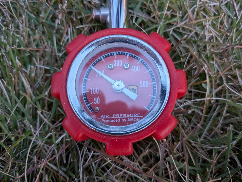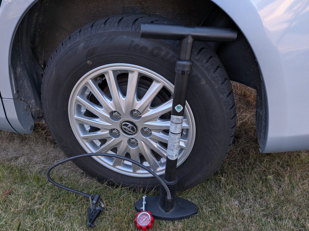 交換後のスタッドレスタイヤの空気圧です。メーカー指定圧は240kpaです。これを上記画像にあるカインズホームで10年位前に購入した自転車用の空気入れで調整してみました。